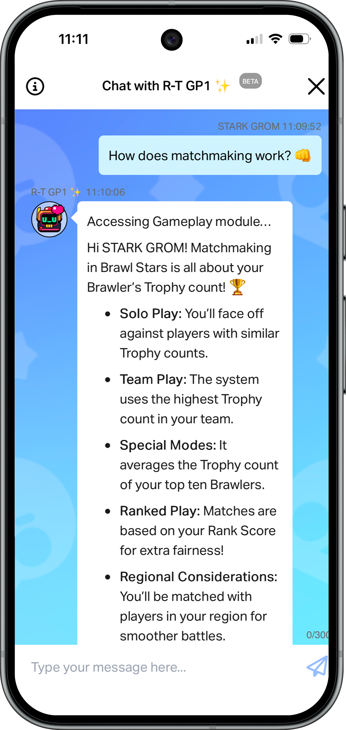 Players are delighted. CSAT scores have jumped by 20% and RT-GP1 even generated its own organic hype on Reddit as the ChatGPT of Brawl Stars.