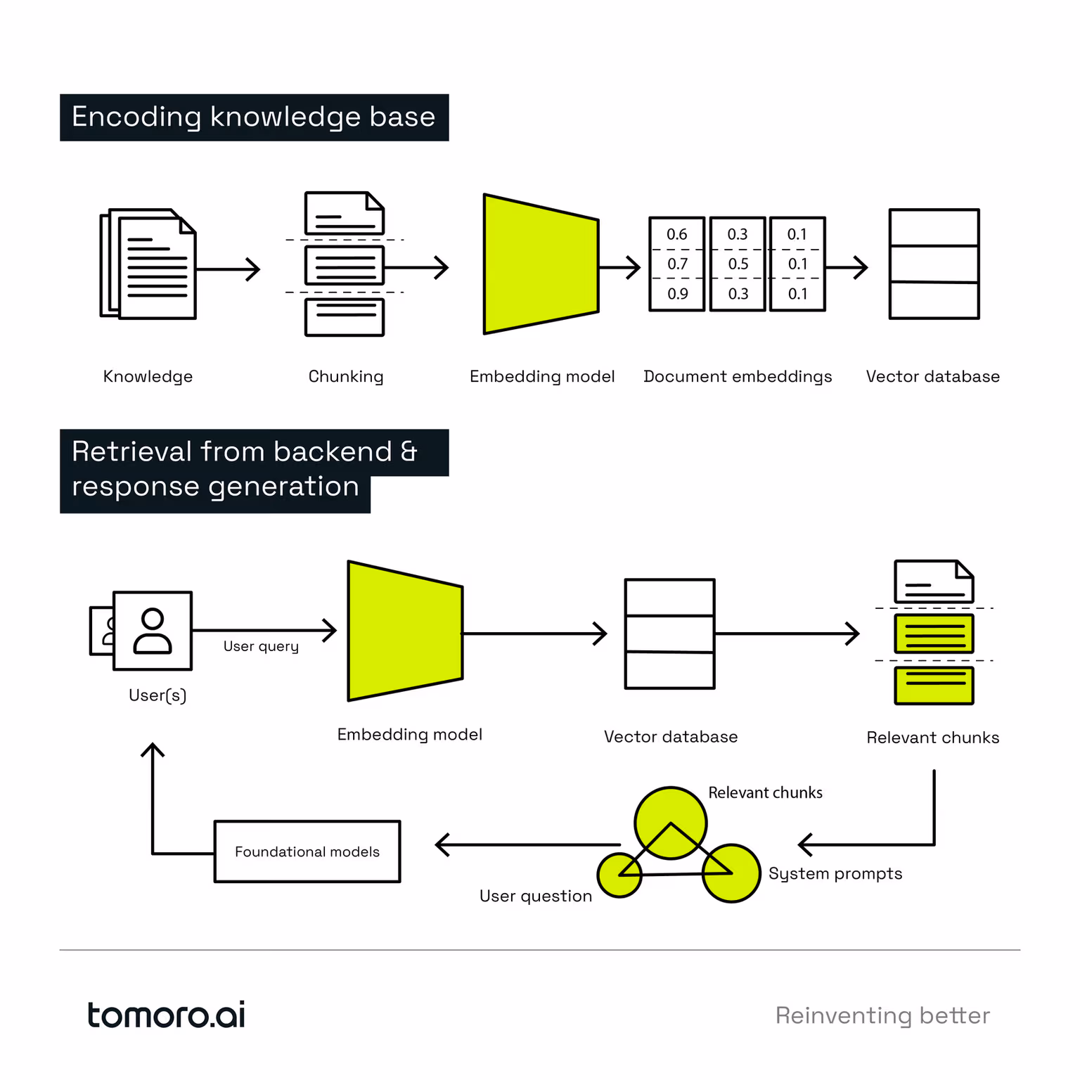 - Deploying a user-facing AI chatbot, which, firstly, converts user questions into strings of numbers (through the same embedding process)