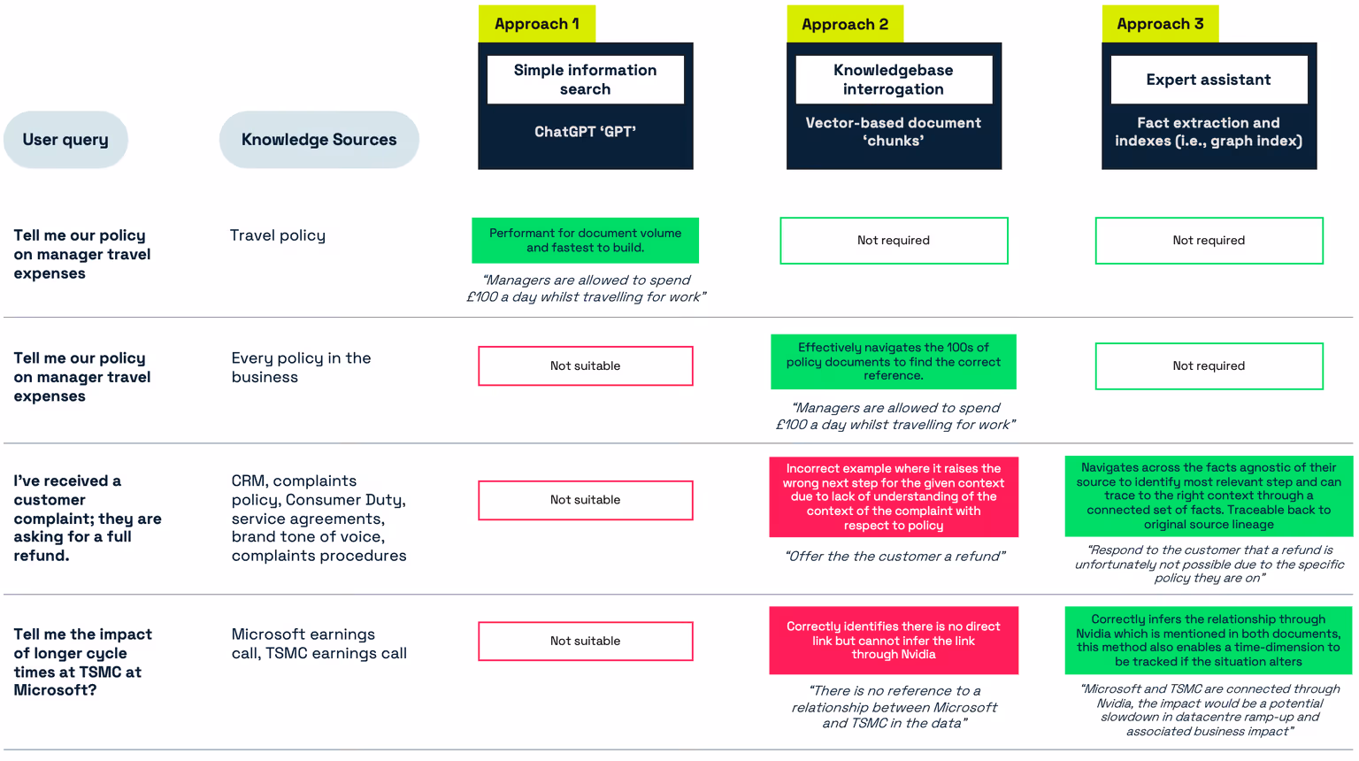 If queries are expected to be more complex (i.e. comparing concepts or inferring new information from existing information) then the kind of retrieval used in Approach 2 will break down. In this case, you need a more thorough approach to extract and index your fact-base from your knowledge, and different ways to join and parse this content which gives you confidence in the response. (You can learn more about how technically to do that here: Graph databases as RAG backends | Tomoro.ai ).