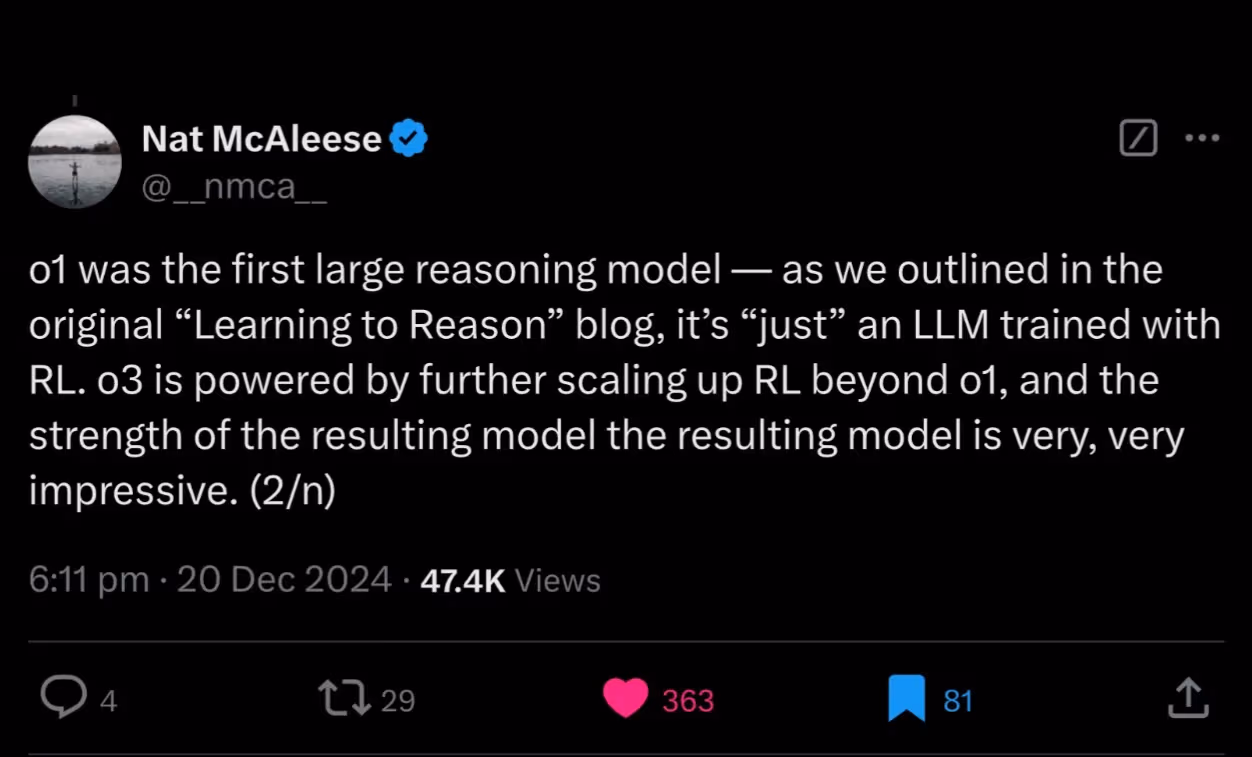 When o1 came out we called it a GPT2 moment for a new class of models, what we meant by that is that while the advances were significant, it represented a new path through which to optimise and realise more gains from the same fundemental breakthrough (like those we saw between GPT 2 > 3 > 3.5 > 4).