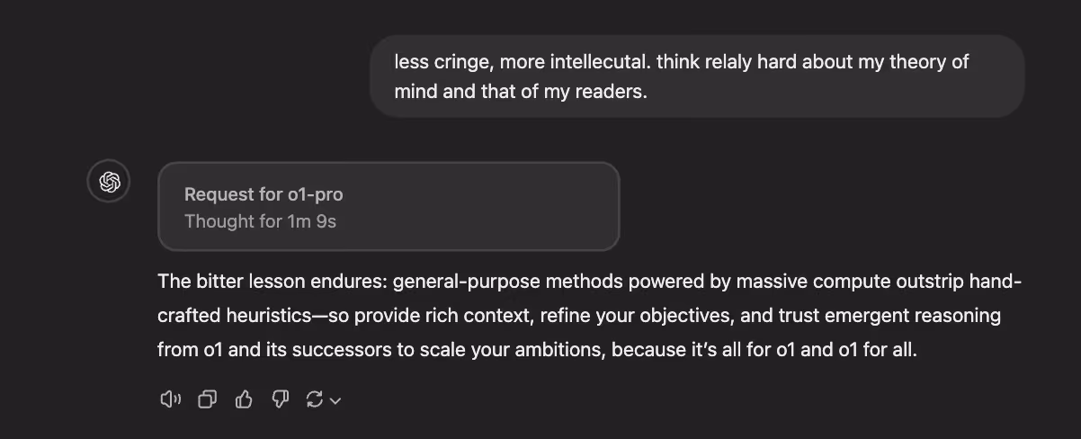 The bitter lesson endures: general-purpose methods powered by massive compute outstrip hand-crafted heuristics—so provide rich context, refine your objectives, and trust emergent reasoning from o1 and its successors to scale your ambitions, because its all for o1 and o1 for all.