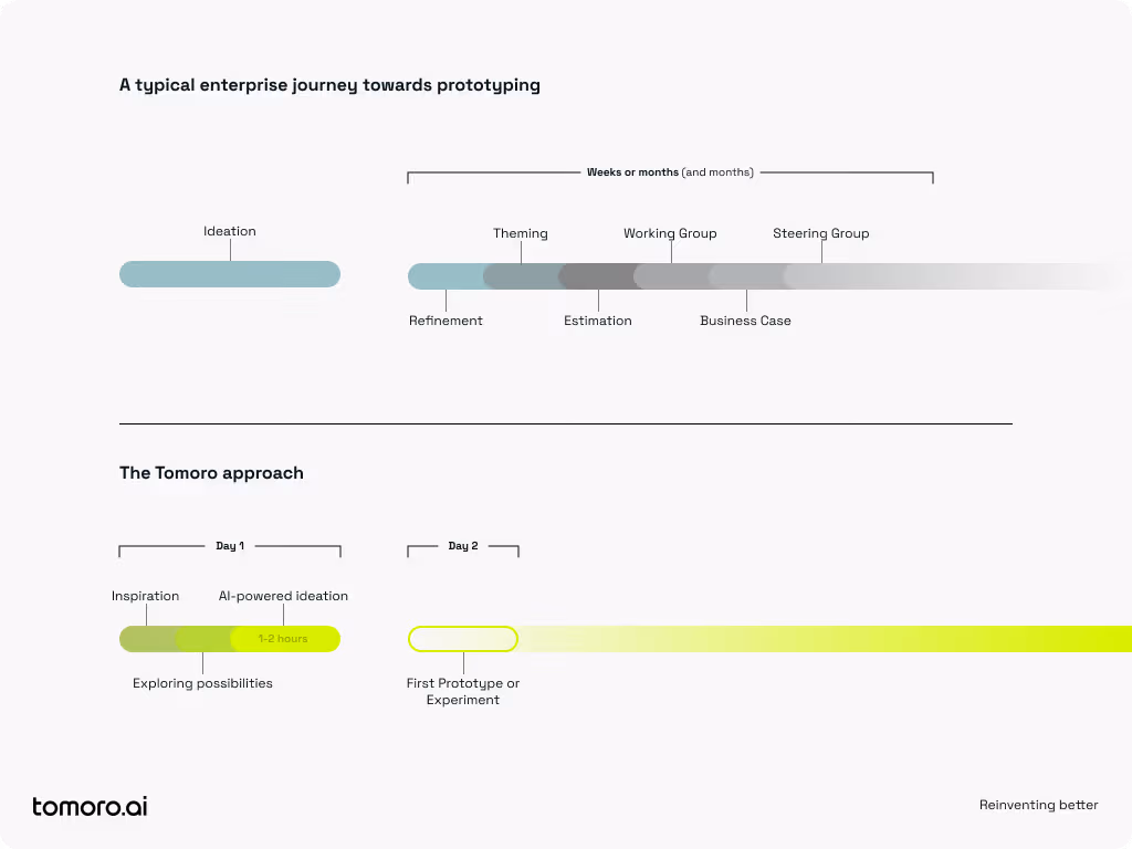 Strategic ideation is often associated with brainstorming, sticky notes and the subsequent blackhole where good ideas go to die. It should be about aligning innovative ideas with an organisations ambitions, fostering interdisciplinary collaboration, and generating the buy-in needed to transform these ideas into reality. At Tomoro, we’ve developed an approach to ideation using AI as a catalyst, turning abstract visions into a prioritised set of coherent, prototype-able ideas within a few hours.