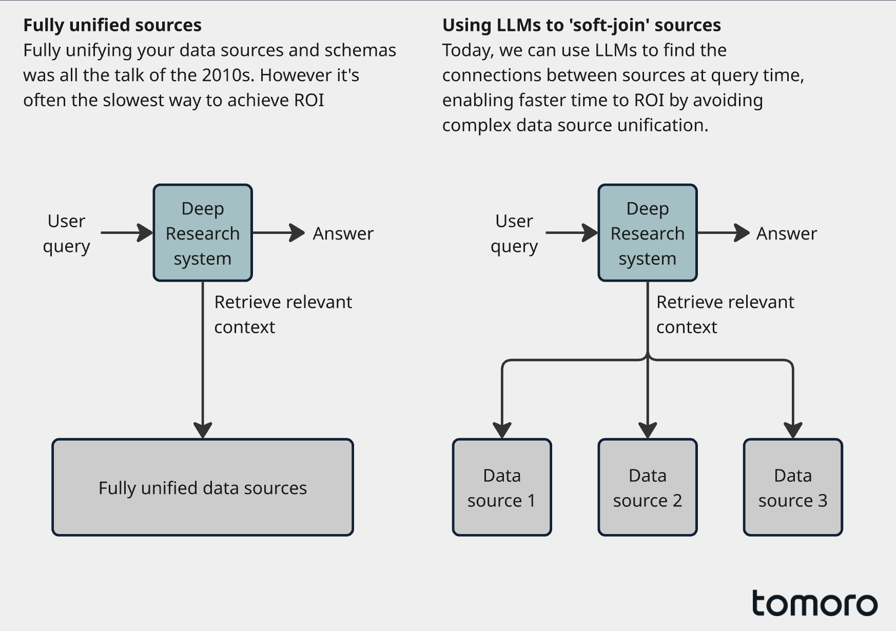 If you have a realistic prospect of adding more sources over time (most enterprises do) then sparser connectivities are underrated. You can expose tens of sources behind a consistent retrieval contact. The system will still be able to work, and critically you keep your ability to deliver quickly. When you come to adding more sources, you don’t have to move the world. You simply can attach a new connector, explain to the core system what it is and how to use it, and let the models take it from there. This works because frontier models today can soft-join two or more data sources at inference time, bridging “Customer ID” in one system to “Client Reference” in another, without anyone writing a formal mapping. We’re not the only team thinking this way. We're not the only team thinking this way: OpenAI's internal data agent is designed to let models reason over 70,000 heterogeneous datasets by making context and connections reachable at query time, rather than forcing full upfront unification.