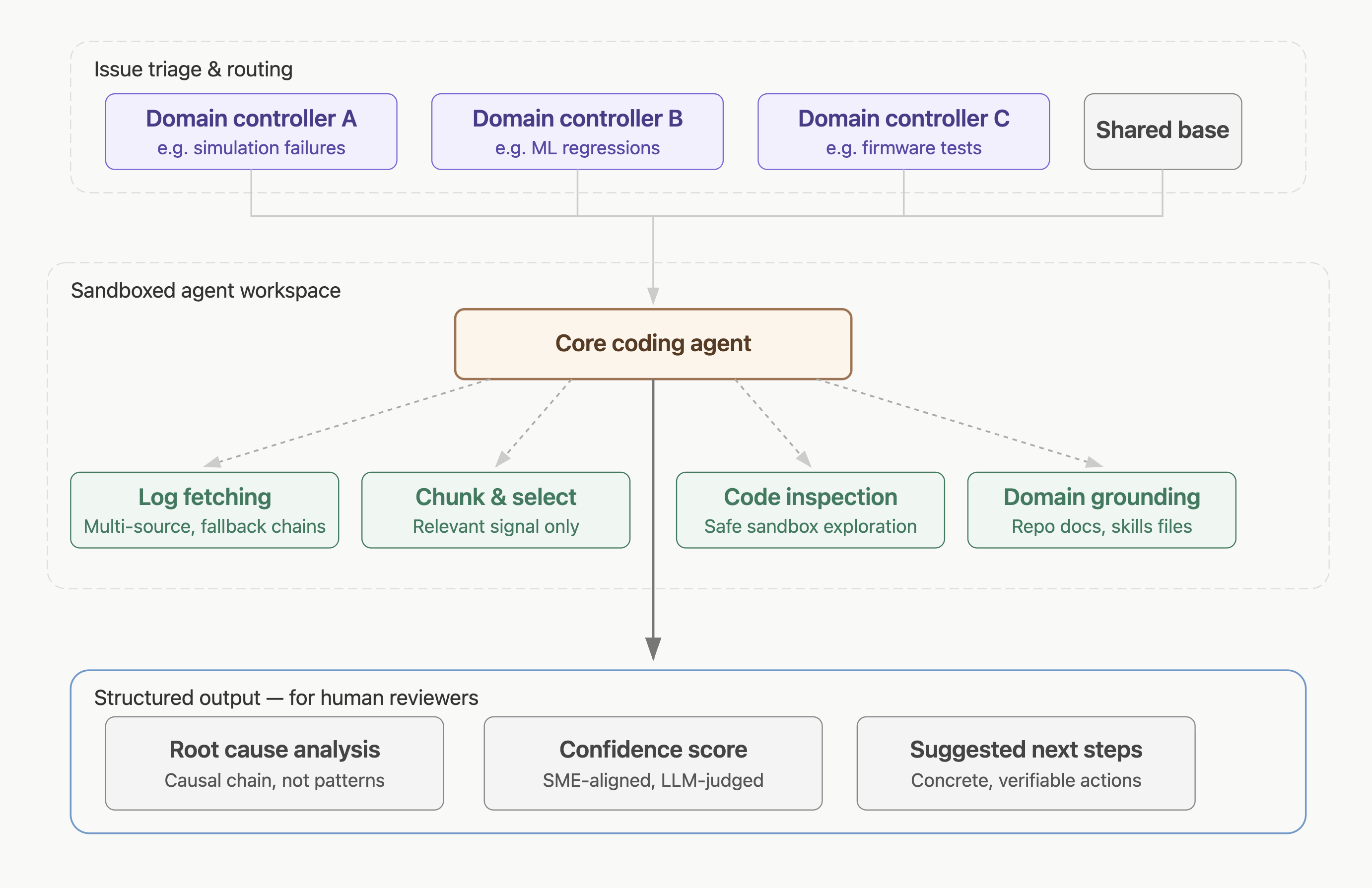 This is especially clear in large-scale debugging workflows. Imagine nightly CI running millions of tests across codebases touched by hundreds of engineers (a reality for one of our clients). When something fails, ownership routing is difficult. The problem might sit in the application code, a dependency, the test harness, or somewhere else in the stack. Logs can run to gigabytes, and the first team to see the issue is not always the team that owns it.