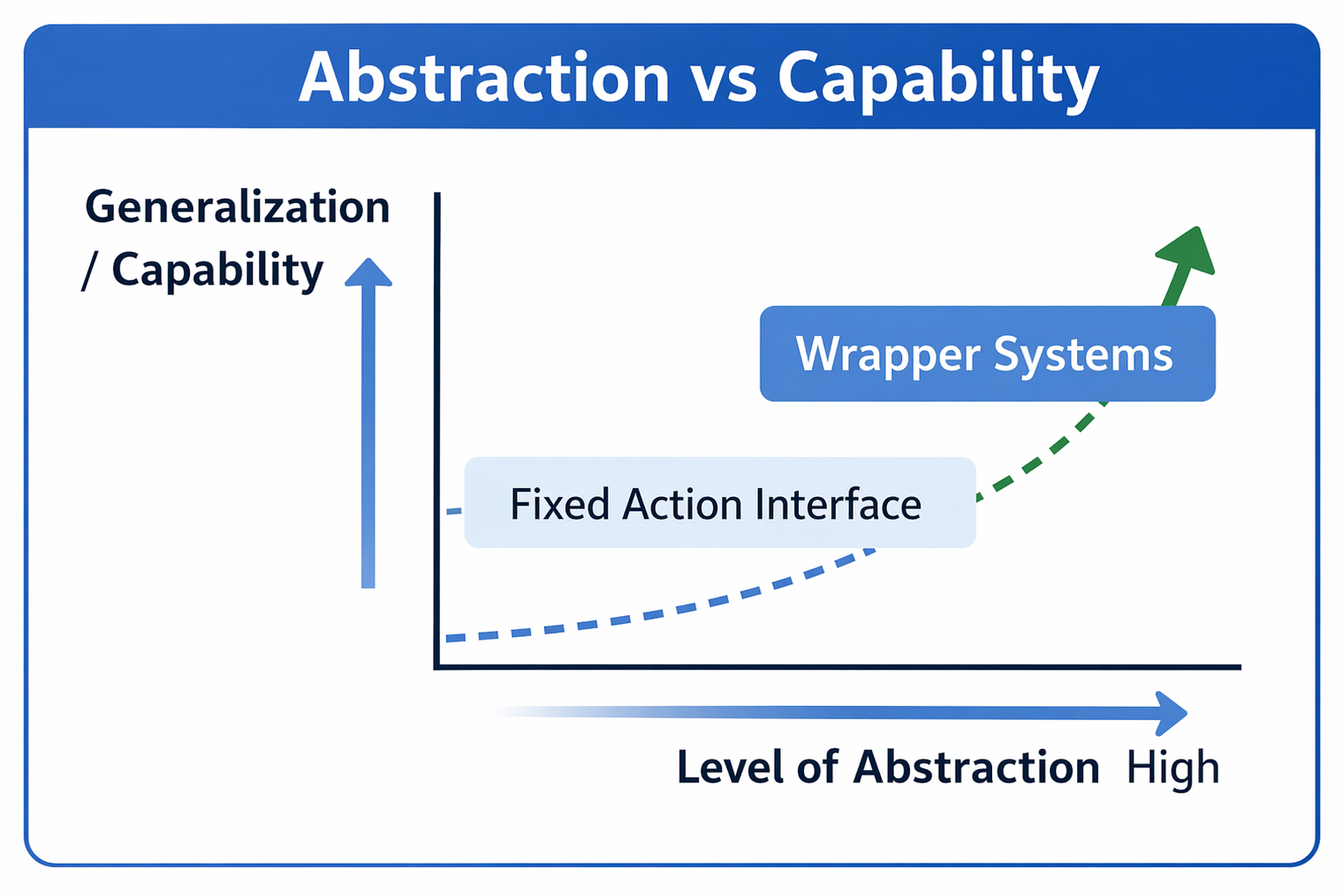 This also changes how the system generalises. A wrapper-based agent generalises well to tasks that resemble the wrappers you have already built. A constrained runtime agent generalises to tasks that share an execution substrate, even when the visible interface is different.