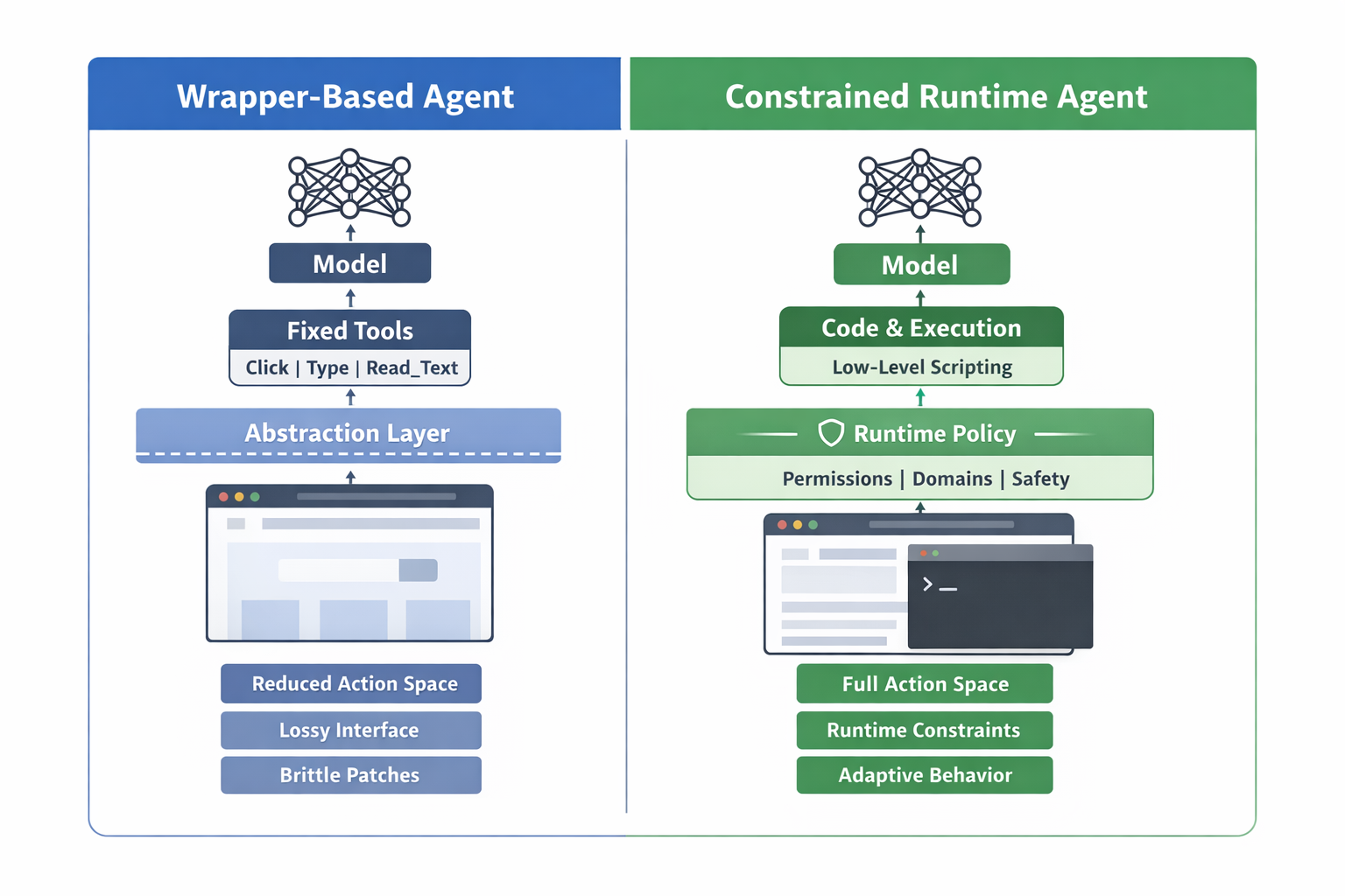 - Recent systems from Anthropic and OpenAI have demonstrated agents that don't just act, but reason about state, recover from errors, and construct task-specific solutions on the fly. This turns the browser into a general execution environment for agents but raises an immediate design question: how much of that environment should we expose to the model?