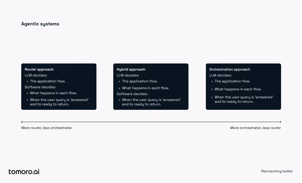 As LLMs continue to advance, the balance between these approaches may evolve. At Tomoro.ai, we lean towards router-based or hybrid architectures for production workloads and reserve orchestrators for open-ended problems demanding dynamic, human-like engagement.