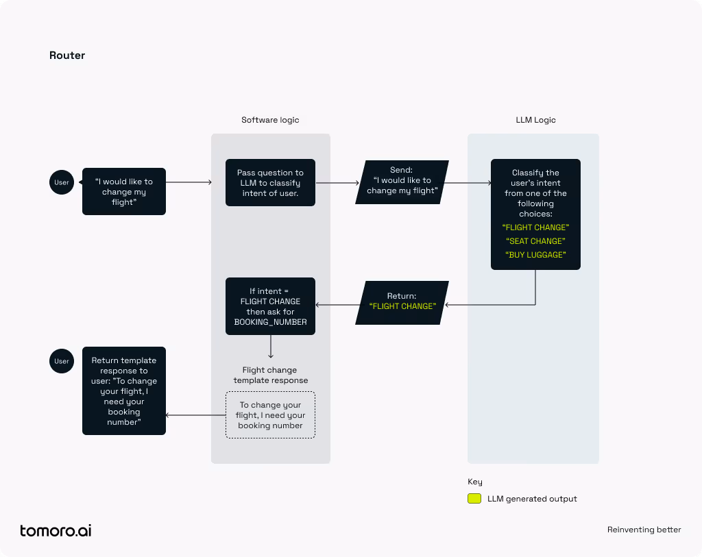 The following is a toy example of an Airline Chatbot Booking agent that uses the ‘Router approach’. We can see that while the LLM helps us to classify the intent of the question from three possible choices, it is ultimately our software that maps this intention to a template text response. Because the LLM is highly constrained, it means the user will experience more consistent behaviour.