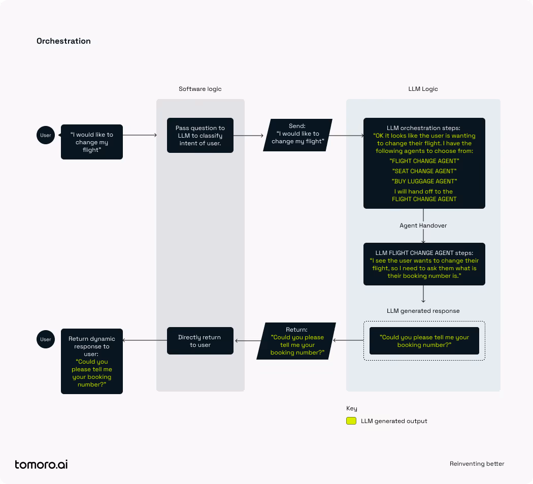 The following example applies an orchestrator approach to the same toy airline problem. Instead of letting software decide what response is appropriate, decision-making is delegated to the LLM layer. Here we have a multi-agent system where a ‘head’ orchestrator agent triages the user query and hands off to an agent specifically designed for changing flights and it ultimately provides the response to the user.