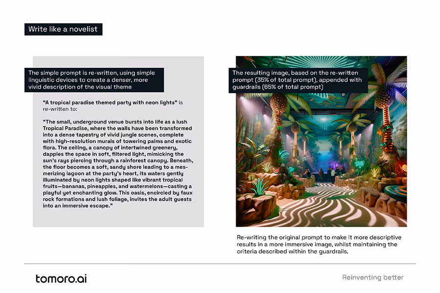 Good writers create vivid, immersive worlds that captivate readers and serve as the backdrop for their narratives. They’re using language to help the reader create a picture in their head – to see that version of the world in their imagination. When it comes to image generation with AI, we have a range of literary devices to trigger the model’s ‘imagination’, leading to richer, more consistent and more compelling images.