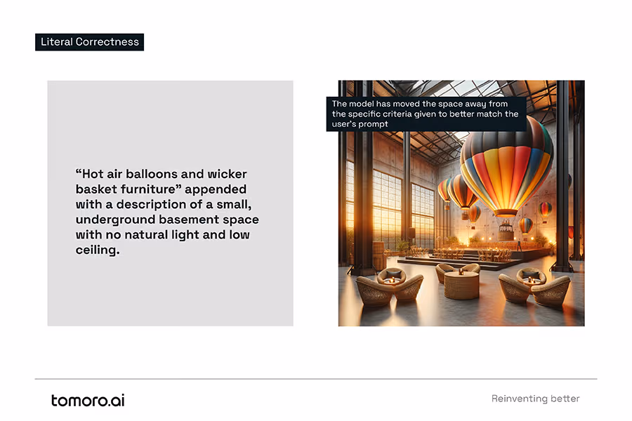 The way that AI models generate images is very literal. Based on the instructions given, it will generate images in the most congruent way possible. The issues we encountered emerged when the concepts and ideas given to the model via a user’s prompt were incongruent with the criteria and constraints we needed to apply to the resulting image.