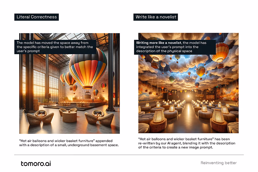 As an example, imagine that the user asks for the room to be themed around hot air balloons, even including a real hot air balloon in the middle of the space itself. We combine the user's prompt with a description of the desired physical space (the small industrial-looking venue with concrete floors and walls, about 6 x 6 metres, with a low ceiling and no natural light) and the model makes its decisions.