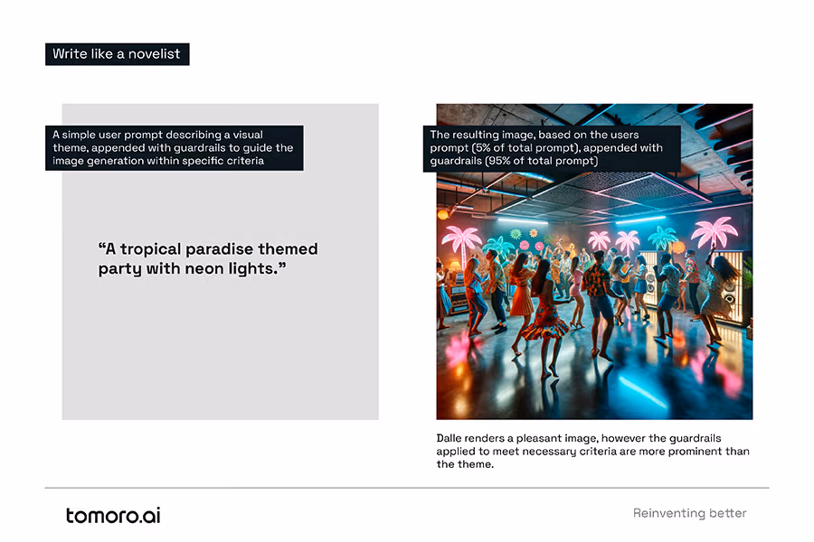 Just in case this isn’t clear… you can still achieve great images from simple prompts! However, when it comes to production use cases for businesses, there tend to be a significant number of constraints and criteria for a set of images. In those cases, we have found that a systematic approach to developing structured prompts and controls significantly increases quality, and safety, performance.