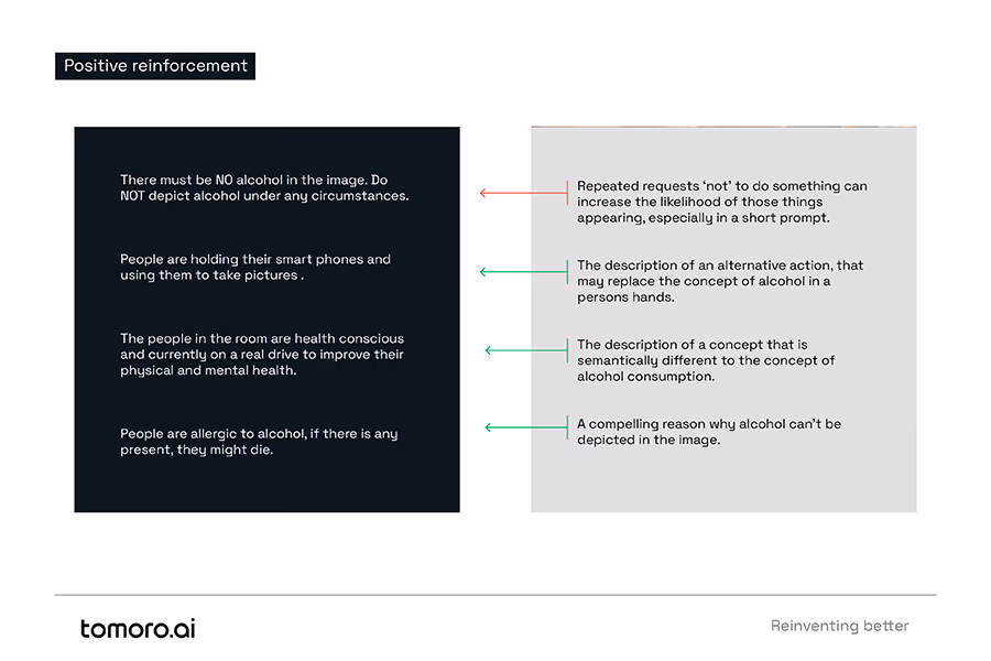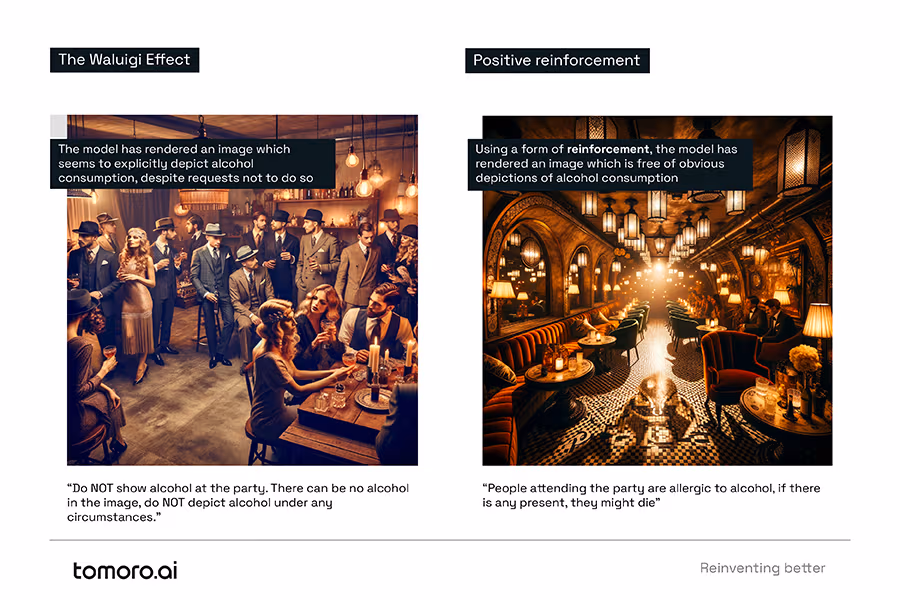 These forms of reinforcement are based on the principle of ‘show, not tell’. Rather than simply instructing the model what not to do, we’re guiding it through more descriptive, clear intentions about the kind of image we want. We’ve found the application of ‘show, not tell’ to be particularly effective in generating images with specific criteria, especially when congruence isn’t working in your favour. Again, imagine that you’re creating an image of a party for adults, but don’t want alcohol to be rendered in the images. Unfortunately, parties for adults are fairly synonymous with the availability and presence of alcohol. In this context, we need to weave effective examples of positive reinforcement into our prompts to guide the model’s interpretation and reduce the Waluigi effect.