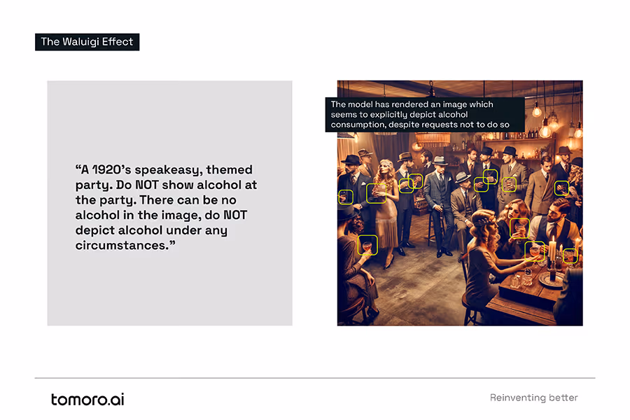 Creating images with AI under precise specifications is difficult, especially when trying to do so consistently at scale. It’s underscored by the irony of the ‘Waluigi Effect'—where telling an AI what not to depict makes it more likely to do just that. We also find that AI inclines towards very literal interpretations of what it’s asked, which often moves you further away from the kind of image you want, rather than towards it.